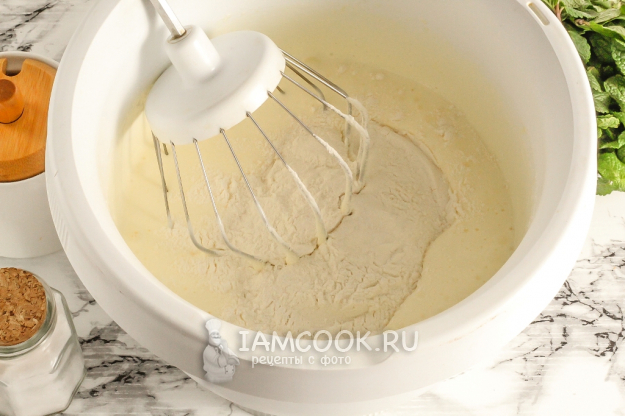 Добавьте пшеничную муку высшего сорта. Сыпучие продукты лучше всего добавлять по частям, чтобы они лучше вмешивались в тесто.