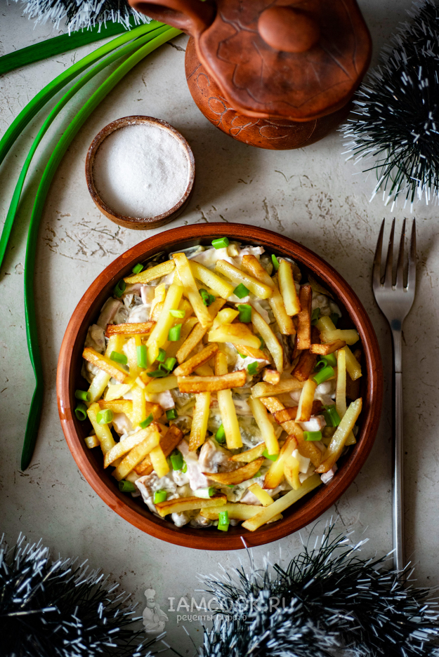 В порционные миски выложим салат, сверху разложим обжаренные брусочки картофеля и мелко нашинкованный зеленый лук. Подаем салат «Вьюга» к столу. Приятного аппетита!