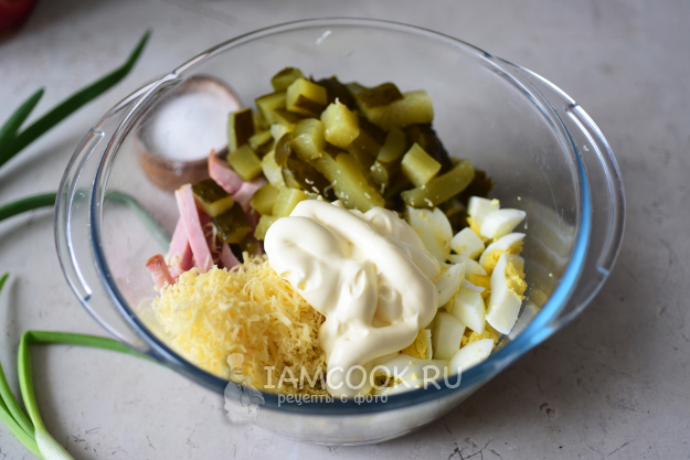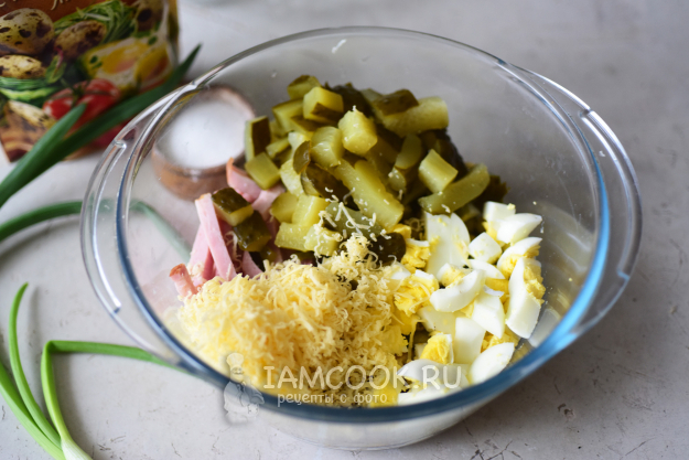 К этим ингредиентам добавим соленые огурчики, нашинкованные брусочками или кубиками, также добавим порезанные кубиками отваренные яйца и натертый на средней терке твердый сыр.
