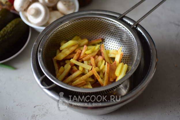 Затем откинем обжаренный картофель на дуршлаг, избавляясь от излишков масла.