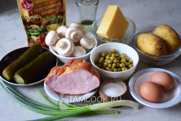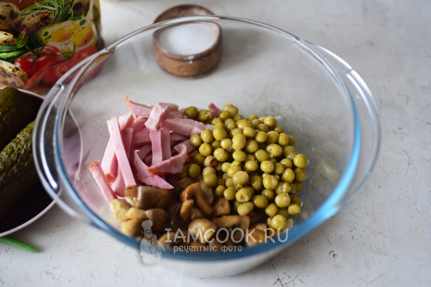 В просторную миску выложим обжаренные шампиньоны, ветчину, нарезанную брусочками, горошек.