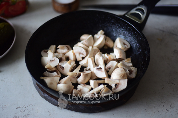 Шампиньоны нарежем на четвертинки и обжарим в растительном масле на сковороде до появления аппетитного золотистого оттенка.