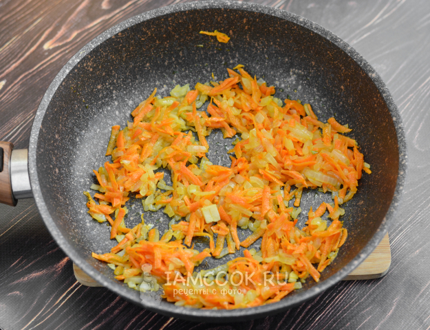 Параллельно на сковороде на масле спассеруйте нарезанный лук и натёртую на тёрке морковь. Овощи пассеруйте до лёгкого золотистого цвета.