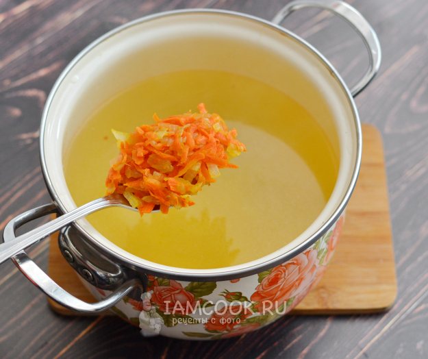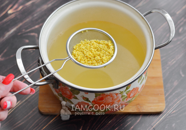 В процеженный бульон добавьте пшено, прибавьте огонь и варите около 10 минут.