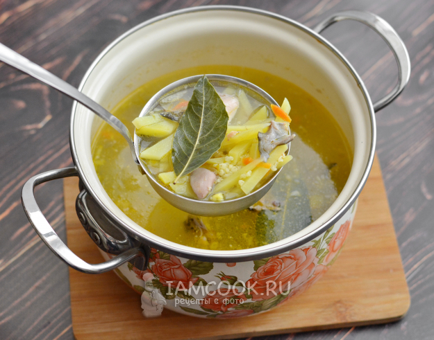 С головы, хвоста и хребта сваренной форели аккуратно снимите мясо, следите, чтобы не попали мелкие косточки. Положите рыбную мякоть в уху вместе с парой лавровых листов. Если нормально относитесь к рыбьей коже, то порежьте её кусочками и тоже добавьте сюда же.