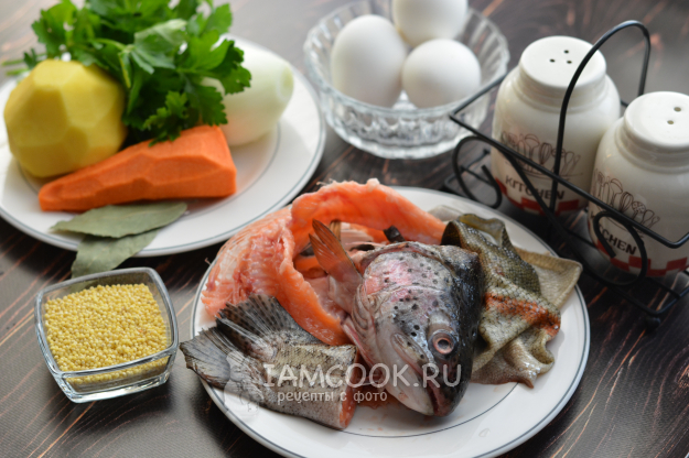 Для ухи возьмите голову, хвост, хребет и кожу радужной форели. Овощи тщательно вымойте, очистите и сполосните. Пшено тщательно промойте на сите.