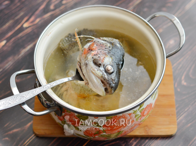Когда вода в кастрюле закипит - снимите тщательно всю пену, убавьте огонь, добавьте соль и варите около 20 минут. После чего рыбу выньте шумовкой на тарелку, а бульон процедите через сито.