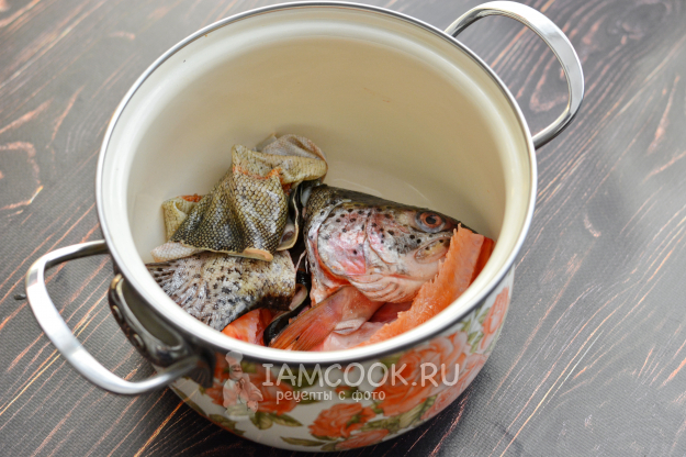 Из головы форели удалите жабры, тщательно промойте голову под проточной водой. Сложите в кастрюлю весь суповой набор форели, залейте водой. Воды берите от 1 до 1,5 литров. Поставьте на плиту и доведите до кипения.