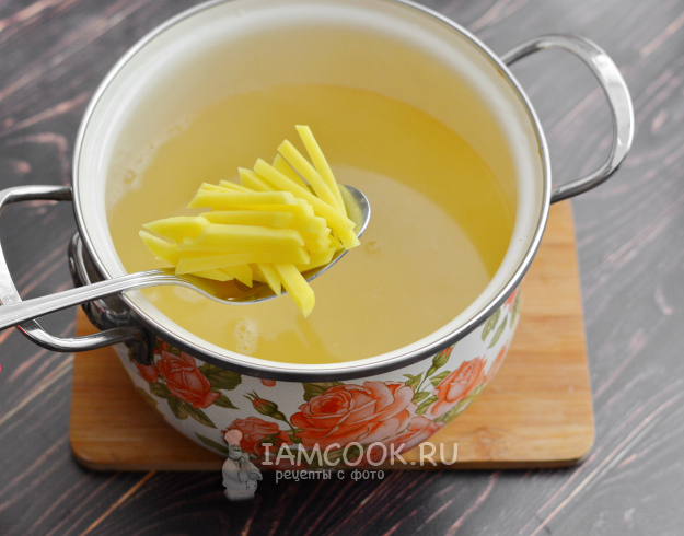 Далее очередь нарезанного брусочками картофеля, варите ещё 5-7 минут.