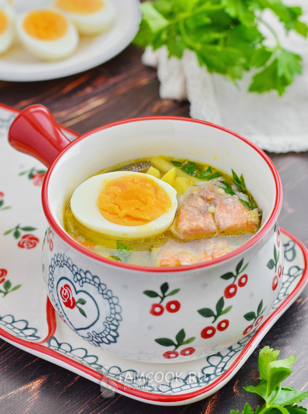 Яйца сварите вкрутую, но варите их не сильно заблаговременно. Лучше параллельно с ухой, чтобы потом положить в тарелку тёплое яйцо.