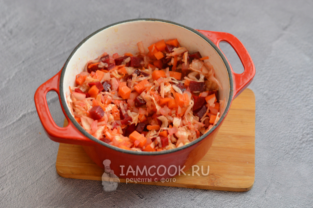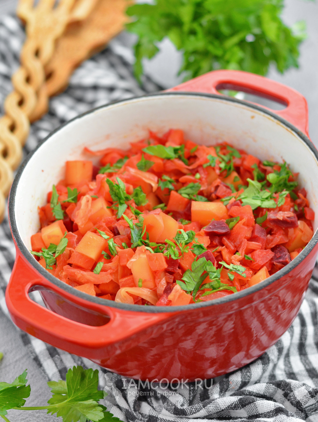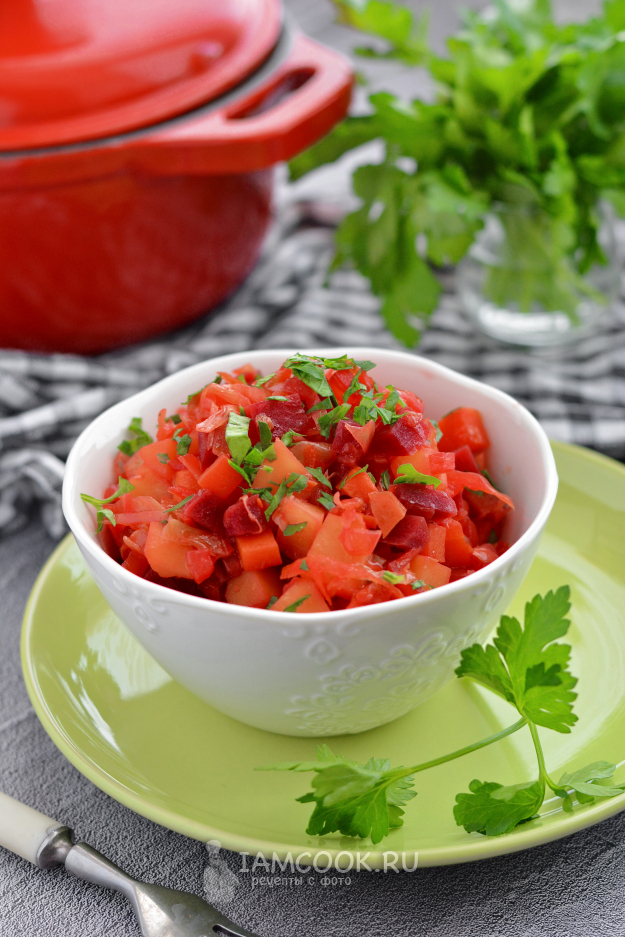 Овощное рагу со свеклой и капустой готово. Кстати, картофель вы можете заменить консервированной фасолью, добавив её в самом конце.