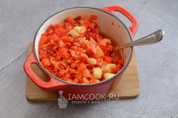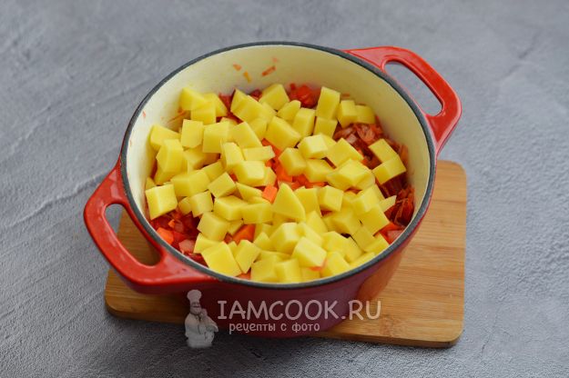 Теперь добавьте картофель и соль, тушите еще около 20 минут.