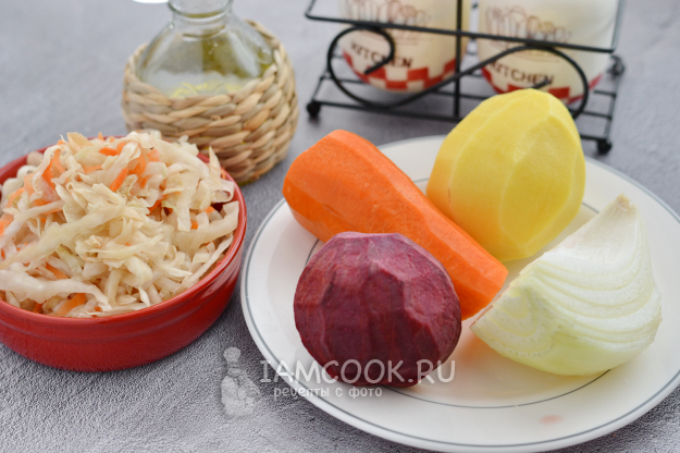 Все овощи для овощного рагу со свеклой и капустой берите примерно в равных пропорциях. Очистите все корнеплоды и лук, сполосните под водой. Капусту квашеную откиньте на сито, слейте рассол. Если капуста сильно кислая, то можно промыть водой.