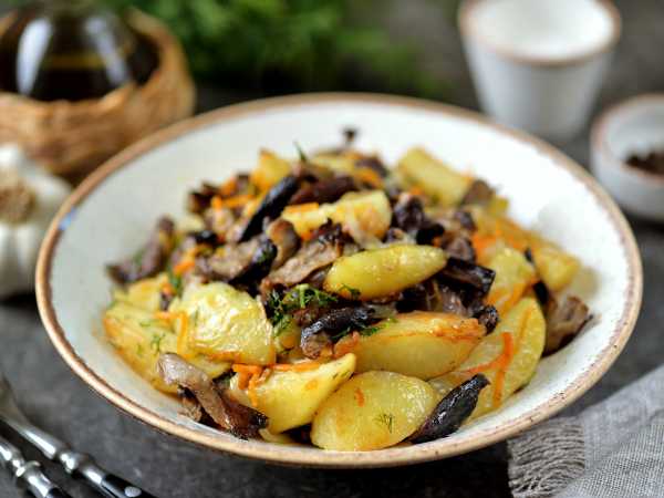 Тем временем не оставляйте без внимания картошку. Готовьте её без крышки на среднем огне, периодически перемешивая, до золотистой корочки. В конце посолите и поперчите.