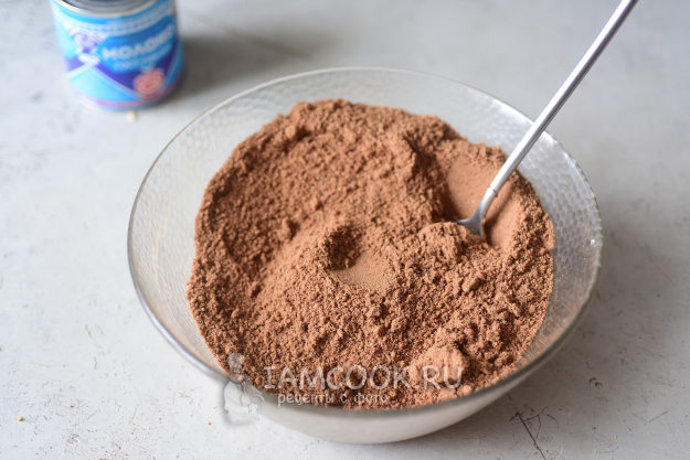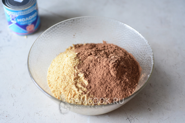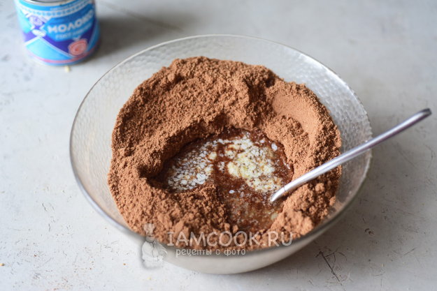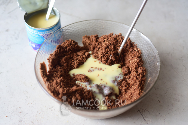 Будем по столовой ложке добавлять сгущенное молоко и вмешивать его к остальным ингредиентам.