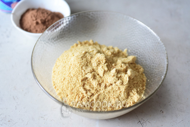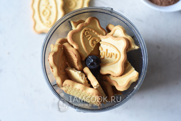 Печенье поломаем руками на кусочки произвольного размера, выложим в чашу стационарного блендера, запустим устройство на 40-60 секунд, до получения мелкой крошки.