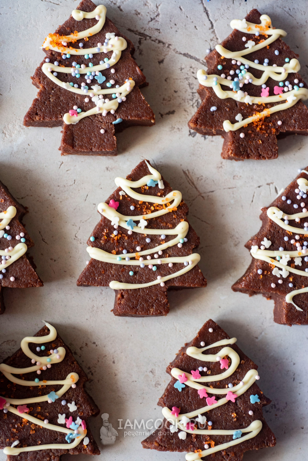 В работе я использую пластиковые формочки для печенья в виде елочек. Шоколадной массой я плотно заполнила эти формочки, после чего с легкостью извлекла из них заготовку пирожного, при этом форма елочки прекрасно сохранилась.