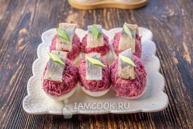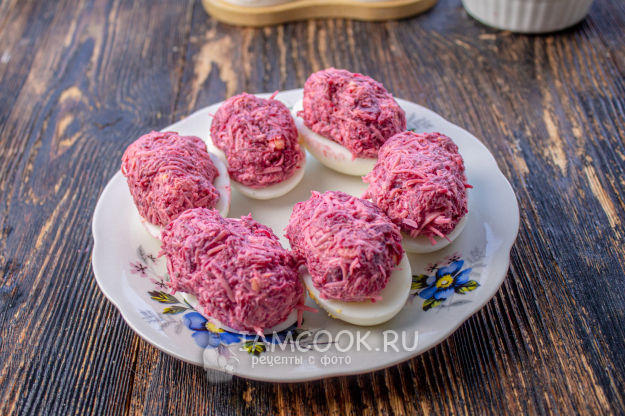 Сырно-свекольной массой наполните половинки яиц.