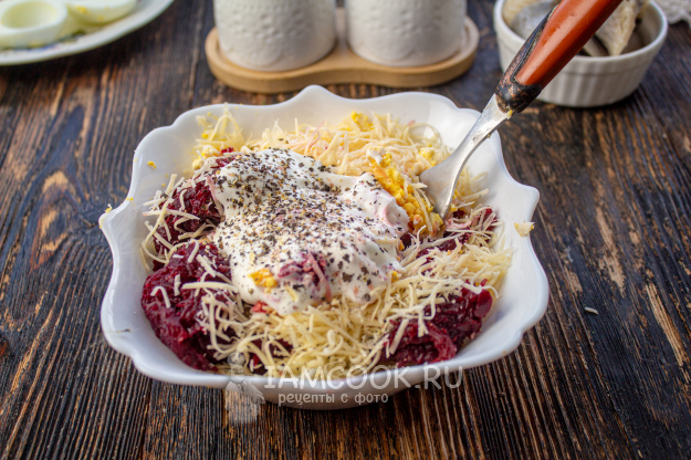 Яичные желтки разотрите вилкой, добавьте натертые сыр и свеклу, посолите и поперчите по вкусу. Добавьте майонез и перемешайте начинку.