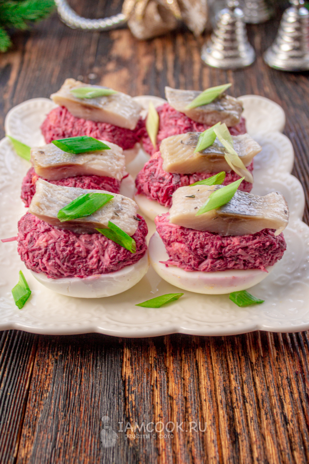Готовую закуску уберите в холодильник. На стол яйца, фаршированные селедкой под шубой, подаем охлажденными. Приятного аппетита!!!