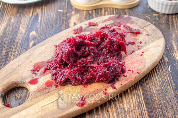 Отварную свеклу очистите и натрите на мелкой терке. Если она водянистая, то отожмите лишний сок.