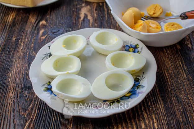 Отварные яйца очистите, разрежьте пополам, удалите желток и сложите в отдельную посуду.