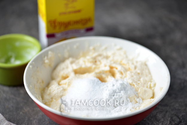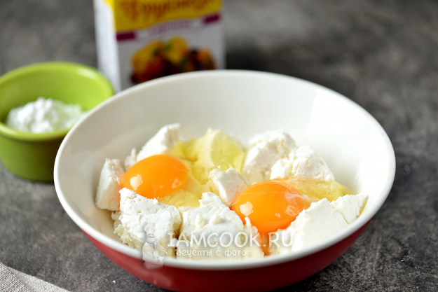 Переложите творог в глубокую миску, слегка разомните его ложкой, вбейте два яйца.
