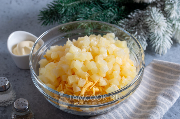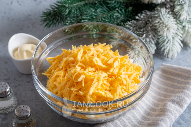 Выбранный твёрдый сыр извлеките из упаковки и натрите на крупной тёрке. Добавьте в салатник.