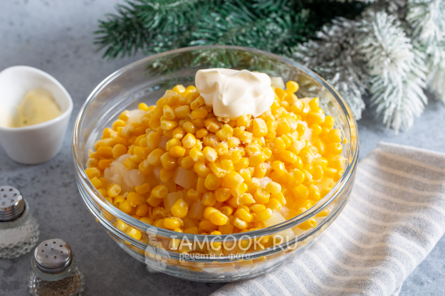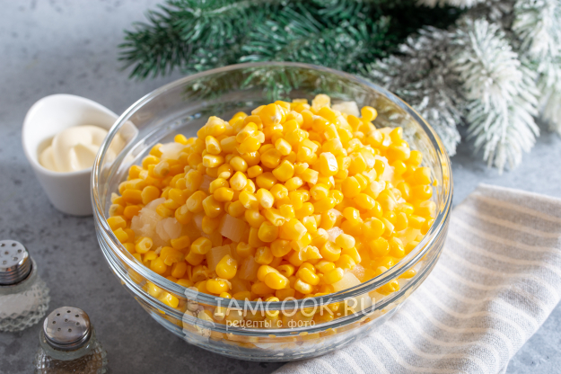 С кукурузы слейте лишнюю жидкость и добавьте в салатник.