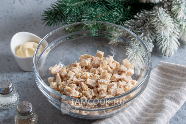 Отварное куриное филе нарежьте на кубики и выложите в подготовленную посуду для салата.