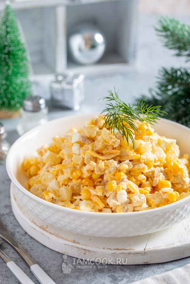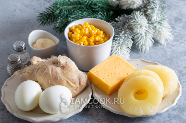 Подготовьте указанные ингредиенты для салата «Парижанка» с курицей, ананасом и кукурузой. Куриное филе следует предварительно отварить в чуть подсоленной воде 20-25 минут. Яйца отварите не дольше 10 минут, затем охладите.