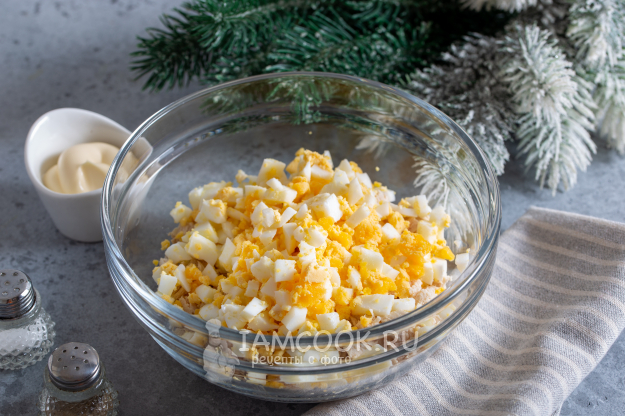 Яйца очистите от скорлупы и порежьте кубиком. Добавьте в посуду к курице.