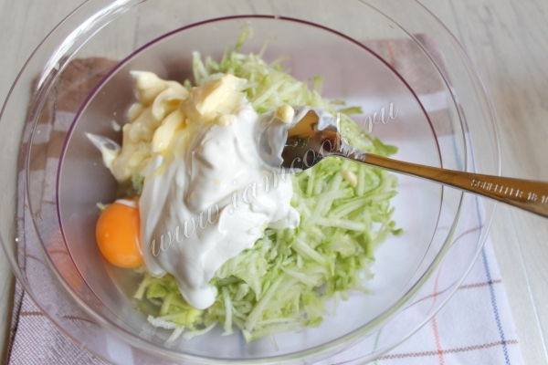 К кабачку добавляем сметану, мягкое сливочное масло и яйцо.