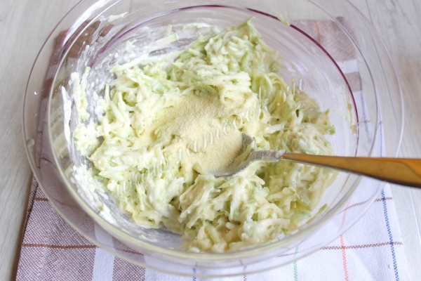 Перемешиваем ингредиенты, добавим сыр, манку и разрыхлитель. Посолим. Не забываем что сыр сам по себе соленый. Далее добавляем муку.