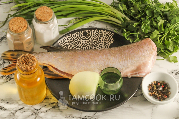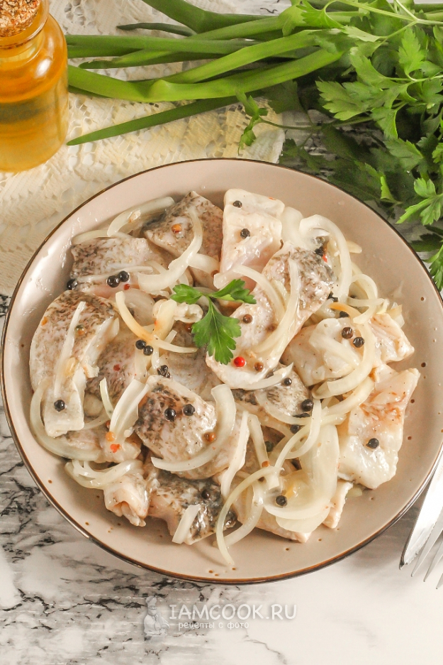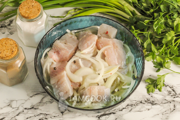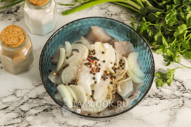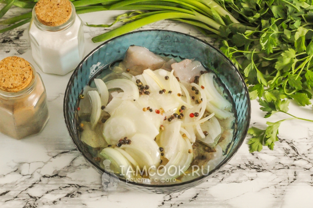 Выложите рыбу в глубокую емкость или салатник. Очистите луковицу и половину нарежьте полукольцами. Добавьте в емкость к рыбе вместе с солью, молотым черным перцем, смесью горошин перца и уксусом.