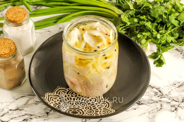 Влейте растительное масло и тщательно все перемешайте, можно даже с небольшим нажимом. По желанию масло допустимо не добавлять, а промариновать рыбу в уксусе и луке, чтобы только при подаче на стол заправить маслом.