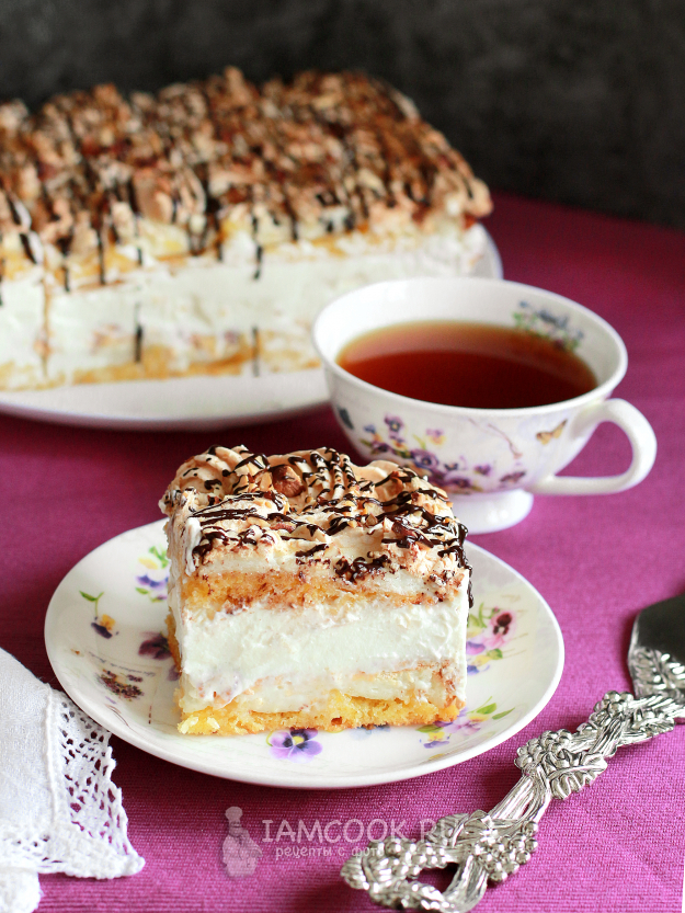 Духовку разогрейте до 170 градусов. Выпекайте корж с меренгой примерно 30-35 минут. Ориентируйтесь по своей духовке. Поверхность меренги должна слегка зарумяниться, а тесто внутри - полностью пропечься. Если меренга начинает быстро темнеть, то накройте ее фольгой.