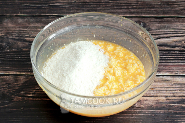 Естественно, масло не вмешается в жидкость как надо. Добавьте частями просеянную муку с ванилином и разрыхлителем. Смотрите на консистенцию теста, не бухайте всю муку сразу.
