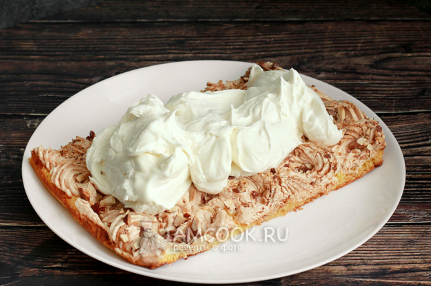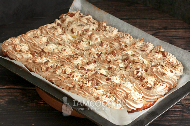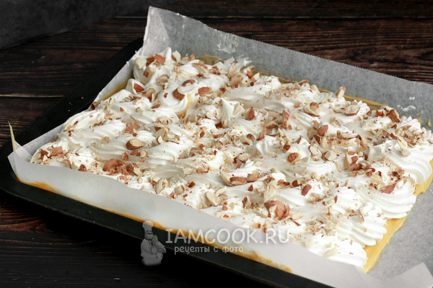 Распределите меренгу по поверхности теста. Это можно сделать ложкой или с помощью насадки и кондитерского мешка. Поверхность посыпьте рублеными орехами. Подойдут любые орехи - миндаль, грецкие, фундук. У меня - рубленый миндаль.