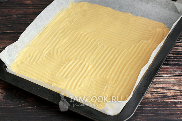 Противень или форму для выпечки выстелите силиконизированным пергаментом и распределите по нему тесто тонким слоем. Слой теста должен быть не более 5 мм, при выпечке его толщина увеличится. Отставьте пока форму в сторону.