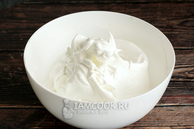 К белкам добавьте щепотку соли, ванилин и начните взбивать до получения рыхлой пены. Затем добавляйте частями сахар и взбивайте до абсолютной гладкости белков. Масса должна получиться плотной и глянцевой, белки не выливаются из формы, а сахар внутри полностью растворен.