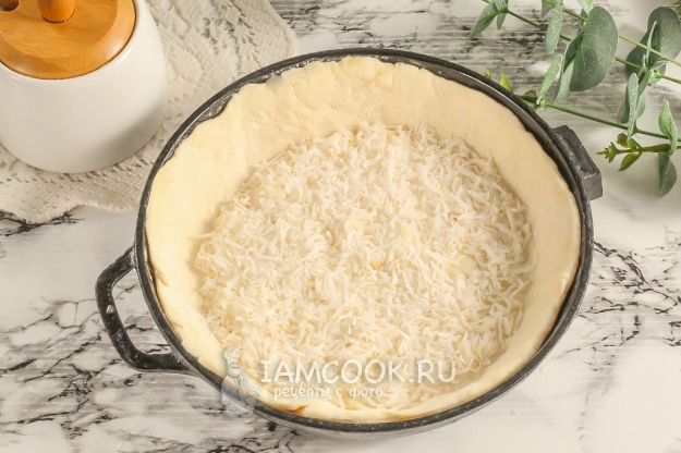 Прикройте начинку тестом, чтобы оно не сильно выросло при запекании. Разогрейте духовку до 180 градусов и отправьте туда форму с пирогом на 25 минут. Обязательно проверьте через 10-15 минут пирог, так как тесто может образовать пузырь на дне и начинка поднимется. Его следует пробить деревянной шпажкой.