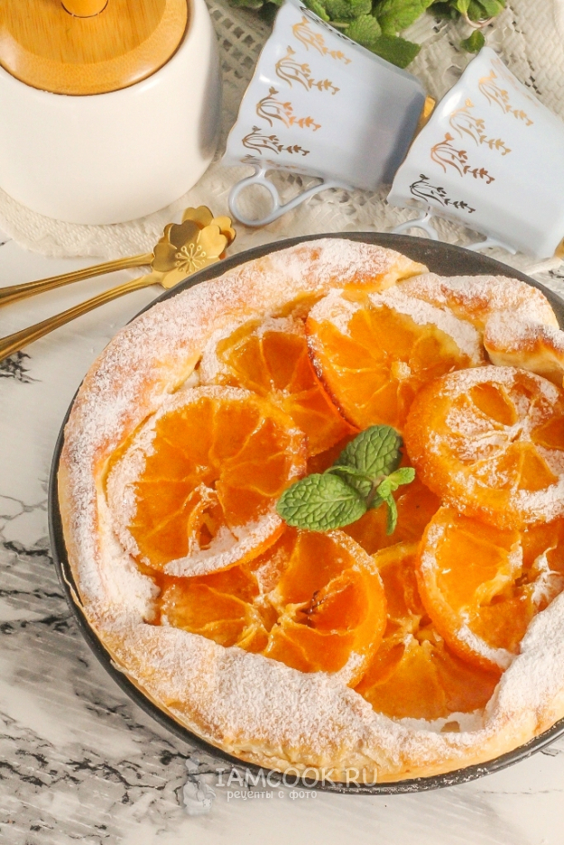 Присыпьте пирог из слоеного теста с апельсинами сахарной пудрой и подайте к столу. Не забудьте приготовить ароматные напитки или прогреть молоко.