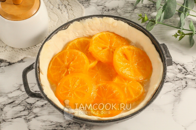 Первым делом подготовьте начинку для пирога. Апельсины ошпарьте кипятком, чтобы цедра не горчила. Нарежьте их кружочками и удалите косточки. Всыпьте сахар на дно сковороды или сотейника с антипригарным дном. Сверху выложите кружочки апельсинов и поместите емкость на плиту. Включите умеренный нагрев и протомите всё примерно 5-8 минут. Нарезка апельсинов выделит сок и он смешается с сахаром, образует сахарный сироп. В этом сиропе протушатся апельсины и станут мягкими.