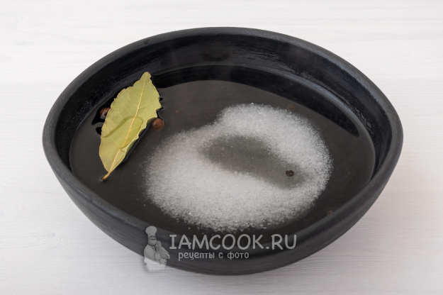 Для раствора вскипятите 400 мл воды. Положите в кипяток чёрный перец, душистый перец, лаврушку, а также соль и сахар. Размешайте, чтобы растворились сахар и соль.