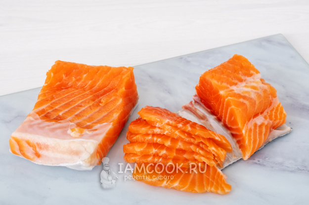 Если филе достаточно большое, то можно разделить его на 2 части и уже потом нарезать на слайсы.