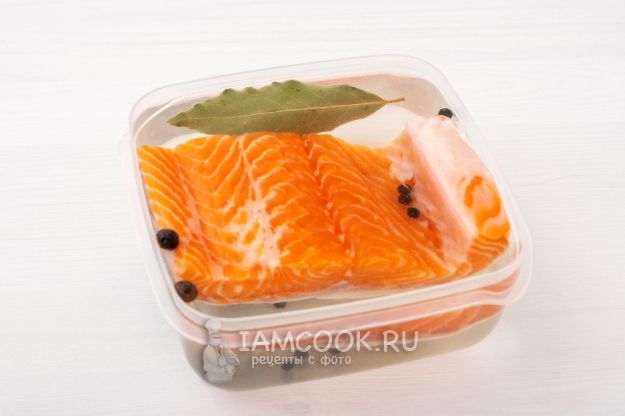 Подберите подходящую по размеру рыбы ёмкость. Слишком широкую или узкую не берите. Положите филе рыбы с кожей в контейнер и залейте остывшим раствором. После чего закройте контейнер крышкой или тарелкой. Важно, чтобы рыба была полностью погружена в раствор. При необходимости воспользуйтесь каким-нибудь гнётом. Поставьте рыбу в холодильник для просолки.