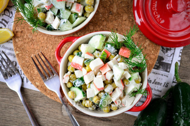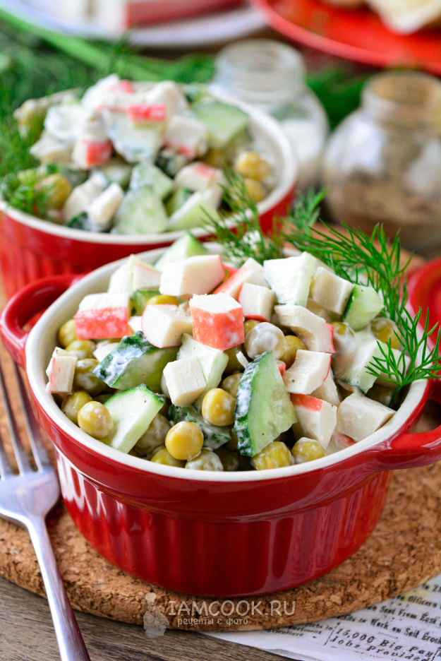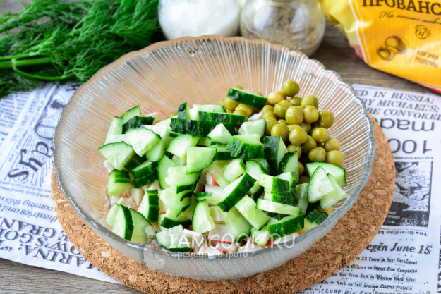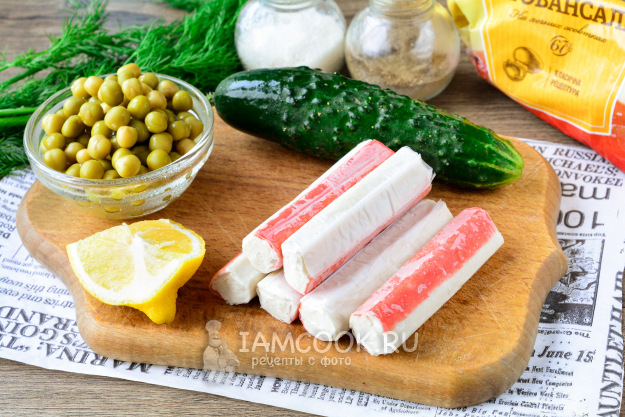 Чтобы приготовить салат с крабовыми палочками и горошком (с огурцами), понадобятся продукты из списка ингредиентов.