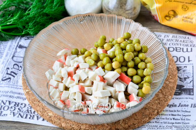Слейте маринад с консервированного горошка, выложите горошек в подходящий салатник. Добавьте к нему нарезанные кубиками крабовые палочки.