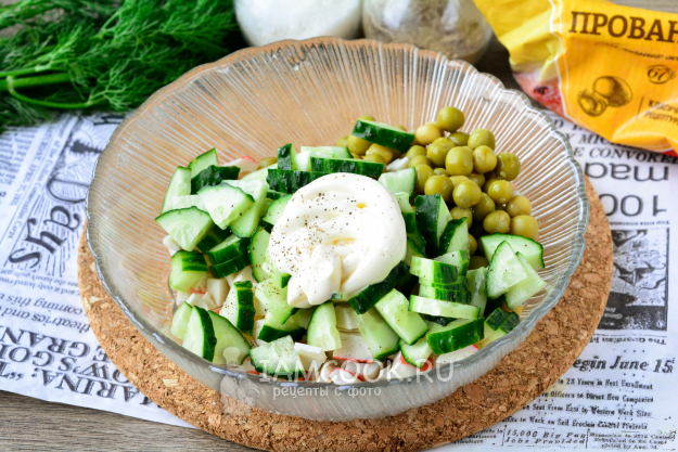 Перемешайте и подавайте салат с крабовыми палочками и зеленым горошком к столу, украсив веточками укропа или другой свежей зелени.